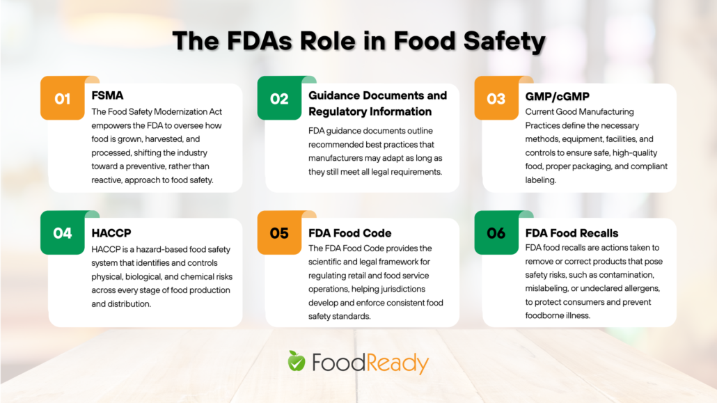 The FDA ensures public health by controlling the national food supply chain. The agency regulates food safety through standards and practices like GMPs, FSMA, HACCP, etc. Its comprehensive approach to inspecting food facilities and farms also helps ensure that products produced domestically and abroad are safe for Americans.
